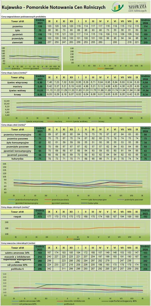 W województwie Kujawsko – Pomorskim we wrześniu 2024 w porównaniu z sierpniem 2024 – ceny były zróżnicowane, zarówno w cenach targowiskowych, skupu żywca, skupu zbóż i roślin oleistych i nawozów wystąpiły zarówno wzrosty, utrzymanie cen oraz spadki. Średnie ceny kształtowały się następująco według danych portalu „Kujawsko –Pomorskie Notowania cen rolniczych”: |