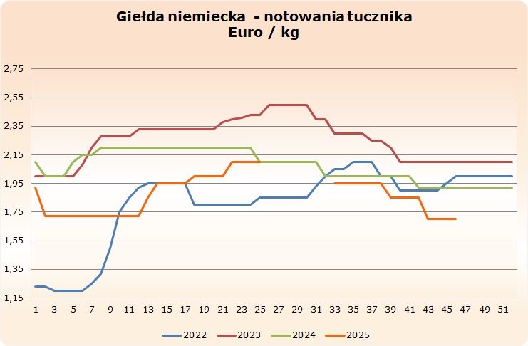 Na Dużej Giełdzie Niemieckiej 29.10.2025 r. cena tucznika WBC klasy E zmieniła się i przez kolejne 7 dni wyniesie 1,70 Euro/kg. |