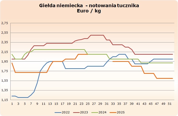 Na Dużej Giełdzie Niemieckiej 17.12.2025 r. cena tucznika WBC klasy E zmieniła się i przez kolejne 7 dni wyniesie 1,60 Euro/kg. |