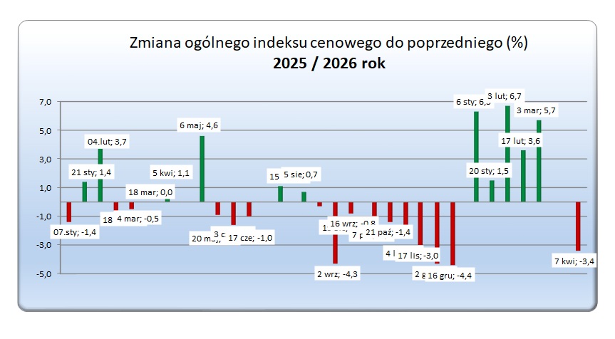 Aukcja z dnia 07.04.2026 r. zakończyła się spadkiem, ogólny indeks cenowy w stosunku do poprzedniej aukcji osiągnął poziom - 3,4 %. Średnia cena podczas aukcji ukształtowała się na poziomie 4,228 USD/t. Podczas aukcji największy wzrost ceny wystąpił w przypadku maślanki w proszku 6,4 %, spadek osiągnąło masło - 8,1 %. |