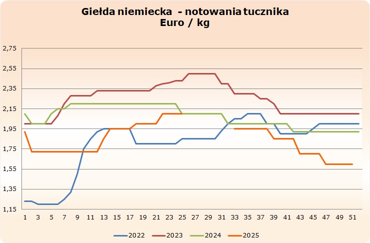 Na Dużej Giełdzie Niemieckiej 10.12.2025 r. cena tucznika WBC klasy E zmieniła się i przez kolejne 7 dni wyniesie 1,60 Euro/kg. |