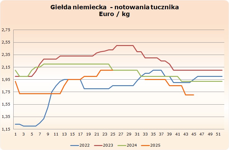 Na Dużej Giełdzie Niemieckiej 22.10.2025 r. cena tucznika WBC klasy E zmieniła się i przez kolejne 7 dni wyniesie 1,70 Euro/kg. |